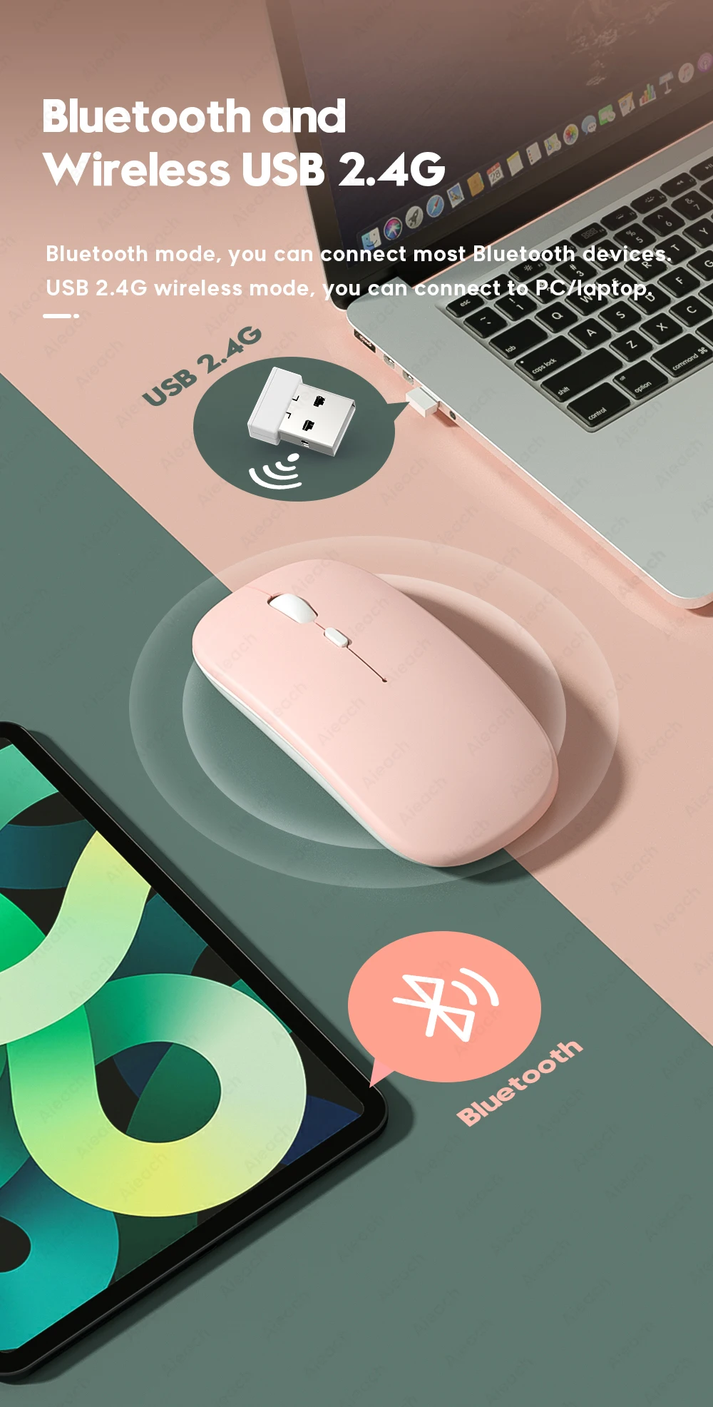 Bluetooth mode, you can connect most Bluetooth devices. USB 2.4G wireless mode, you can connect to PC/laptop.