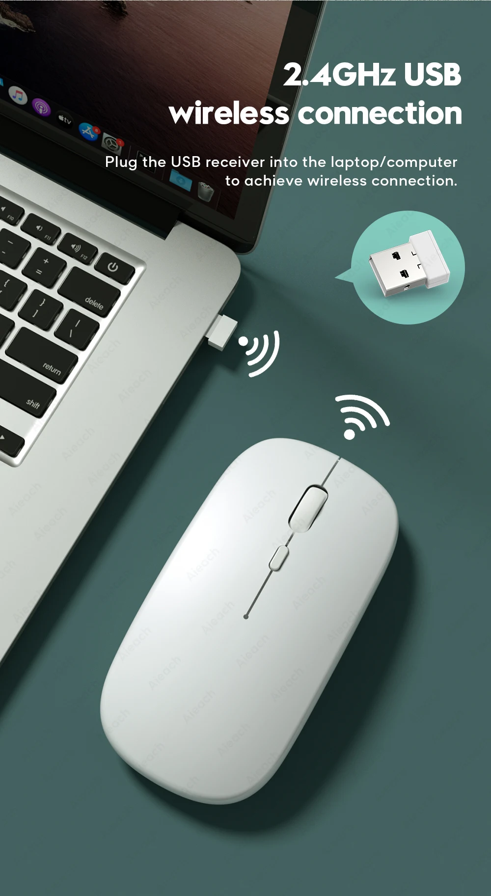 Plug the USB receiver into the laptop/computer to achieve wireless connection.